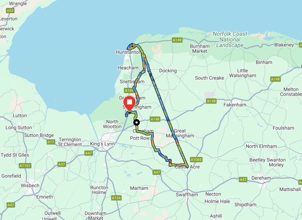 Total distance for the ride was a little over 80 km with an elevation gain that was much greater than Garmin had forecast at 745 metres. We’ve had a very dry spring and I would guess the route would be something of a different proposition in periods of wet weather. I would conclude by highly recommending Norfolk for cycling but particularly incorporating Peddars way.
