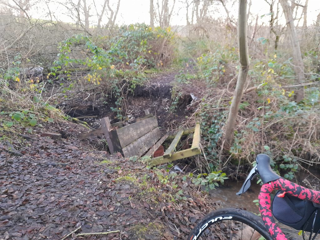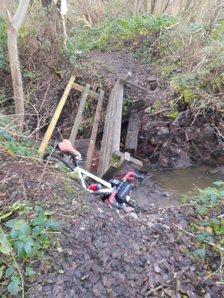 Making my way out of the home town, across Papplewick Moor and through Samsom Wood I decided to try a new footpath linking two main roads to avoid the traffic. That was the real start of my adventure. Having crossed a field into the nearby coppice I was in for a surprise. Within this small patch of trees runs a stream that feeds Beanford Ford. The narrow wooden bridge across the stream had been partially washed away during recent floods forcing a precarious crossing of man and bike.