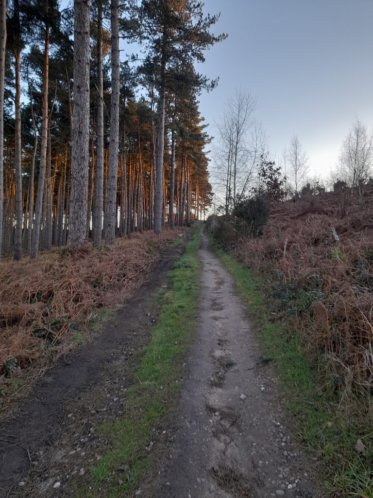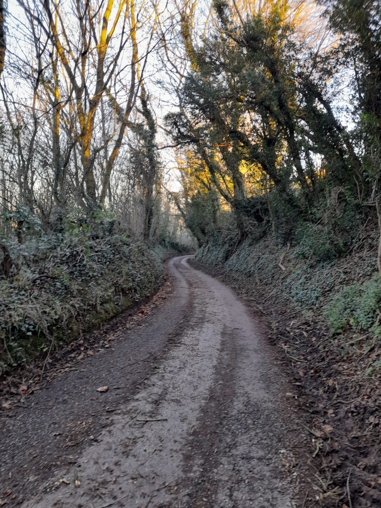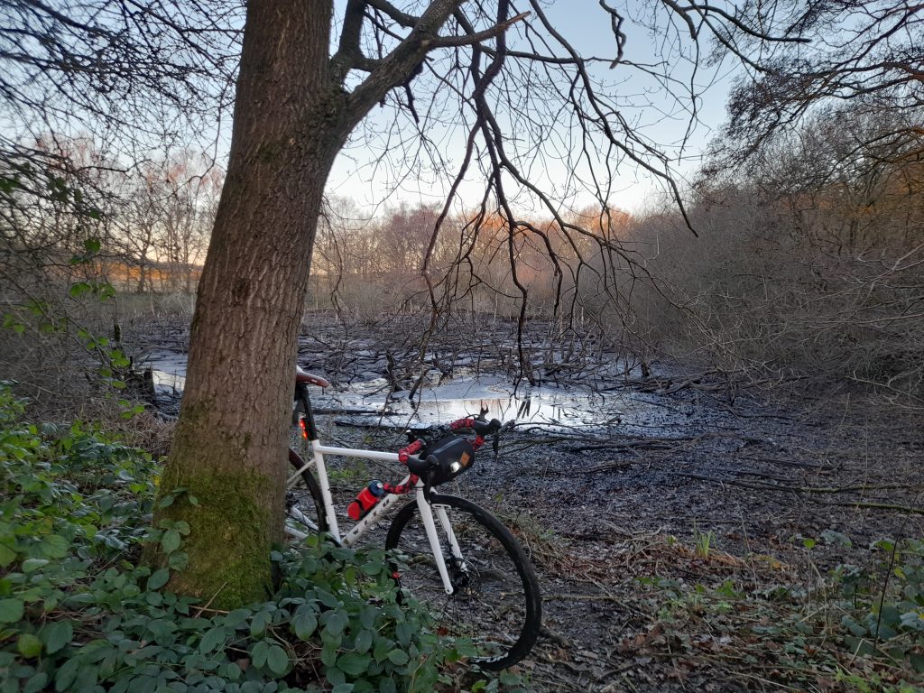 Having made my way over the stream hauling my heavy winter bike down and out of the obstacle I continued out of the wood and along a delightful track to the main road. The main road was thankfully deserted this early on a bank holiday.
