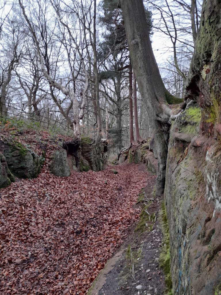 Day 3: The last and final day was back home to Hucknall from Worksop. It’s a route that I am mainly familiar with retracing my steps along route six and then heading east onto the outskirts of the Welbeck Estate. This is another grand estate that was the seat of the Duke of Portland. Unlike Clumber it remains in the private ownership of Welbeck Estates Limited and the residence of the Duke of Portland. This means that there is no public access beyond the established rights of way. Despite this denial of access to commoners the route through Welbeck that includes Drinking Pit lane is one of unquestionable fascination. It’s possible to imagine the countless travellers who have cut a path through the sandstone hollow. Many more have left their mark carved into the sandstone, something I would advise against. On this occasion the deep hollow was part filled with fallen leaves, protected from the elements by the steep sides and tree cover.