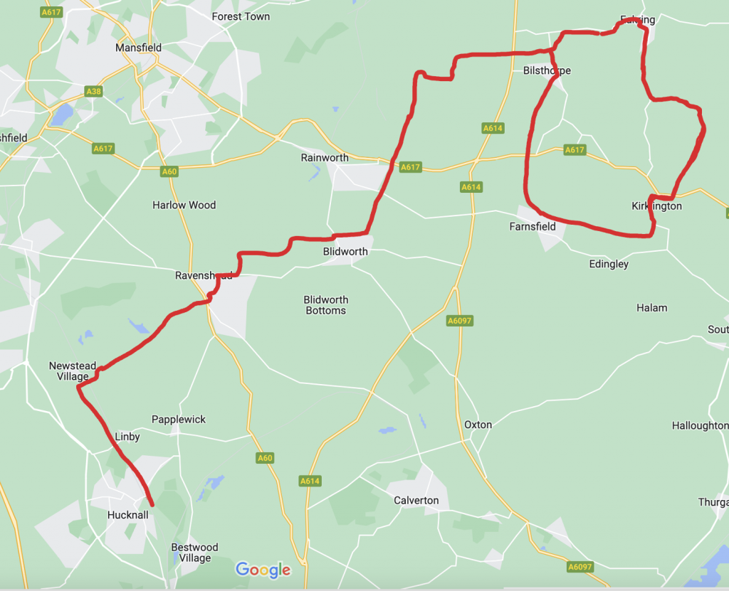 This mid-mileage route takes in National Cycle Network (NCN) Routes 6 and 645 through Newstead Abbey to Bilsthorpe, before heading out towards Eakring. There then follows a technical section emerging at Kirklington where the route picks up the Southwell Trail back to Bilsthorpe to retrace its tracks back to the starting point in Hucknall.