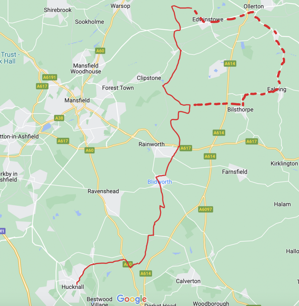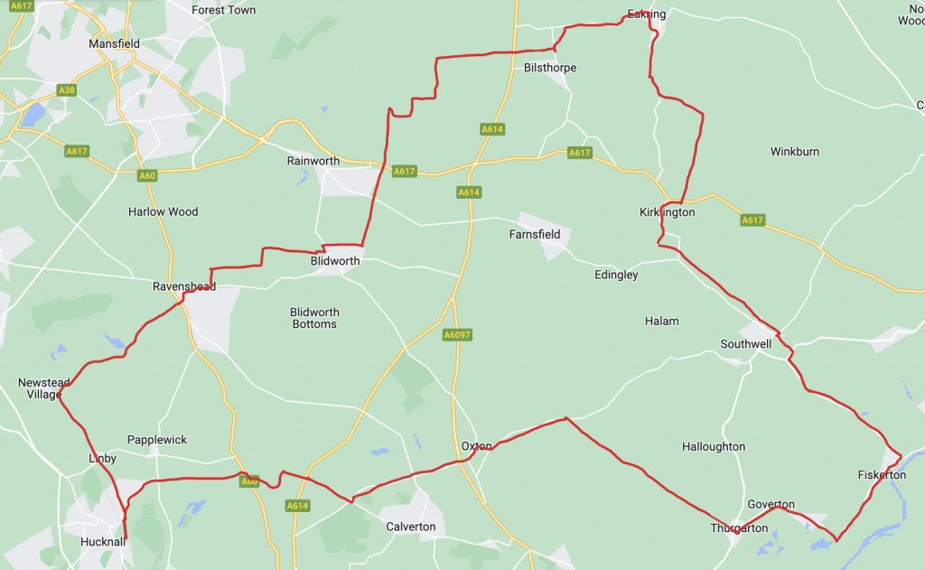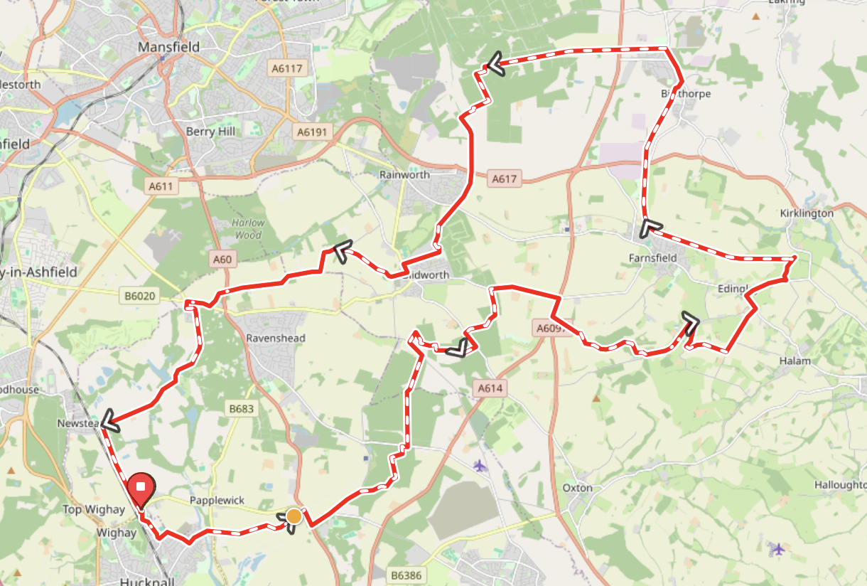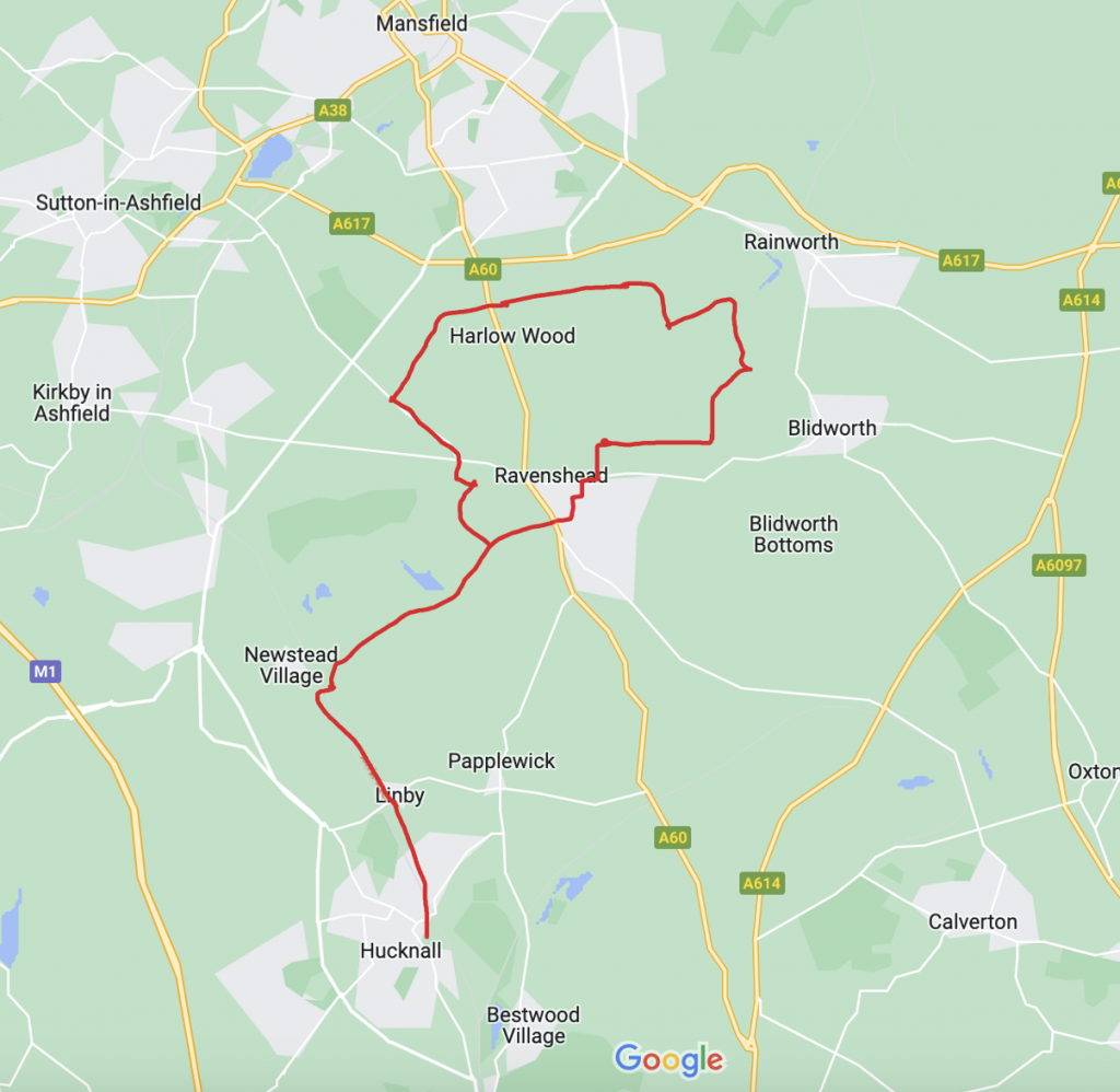 A route offering around 39 km of gravel but many of the road sections are quiet, with some short exceptions. The first half replicates GR1 taking the rider along NCN 6 trough Newstead Abbey and Blidworth before making its way into the southern edge of Sherwood Forest at NCN 645 and out towards Eakring.