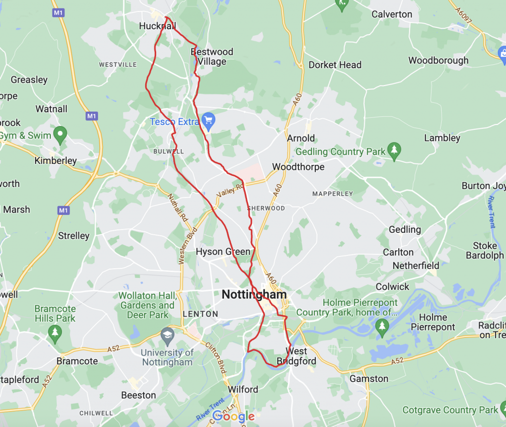 Leaving on the West side of the Viaduct travel along the Erewash Canal towpath returning to Eastwood, the DH Lawrence Museum and finally the gravel tracks of Moorgreen Reservoir and the challenging climbs of The Felly. After a welcome stop off in Newstead onwards returning to Hucknall via NCN 6.