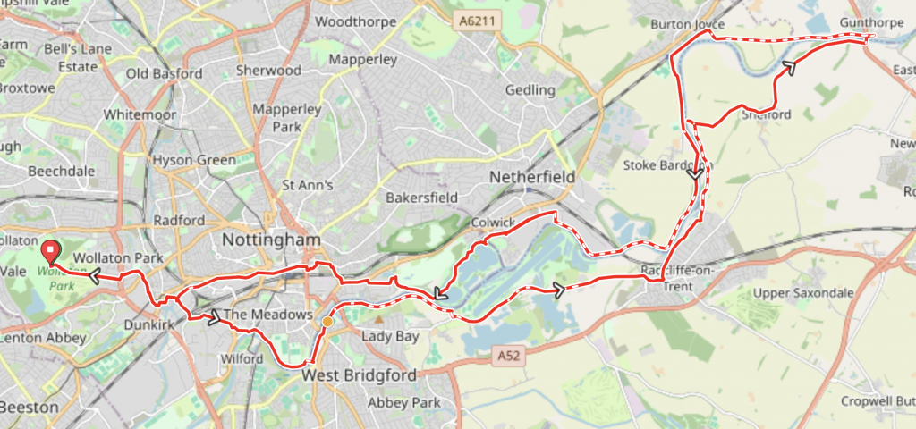 Turning south onto quiet unclassified lanes GNR 5 brings you to Collingham before making your way into Newark where you can visit the castle and take advantage of the many refreshment options. Leaving Newark there is a purposeful section of cycling infrastructure (NCN 64) that is followed by numerous villages and short sections of gravel before finally arriving at Gunthorpe Bridge, the last stop before home.